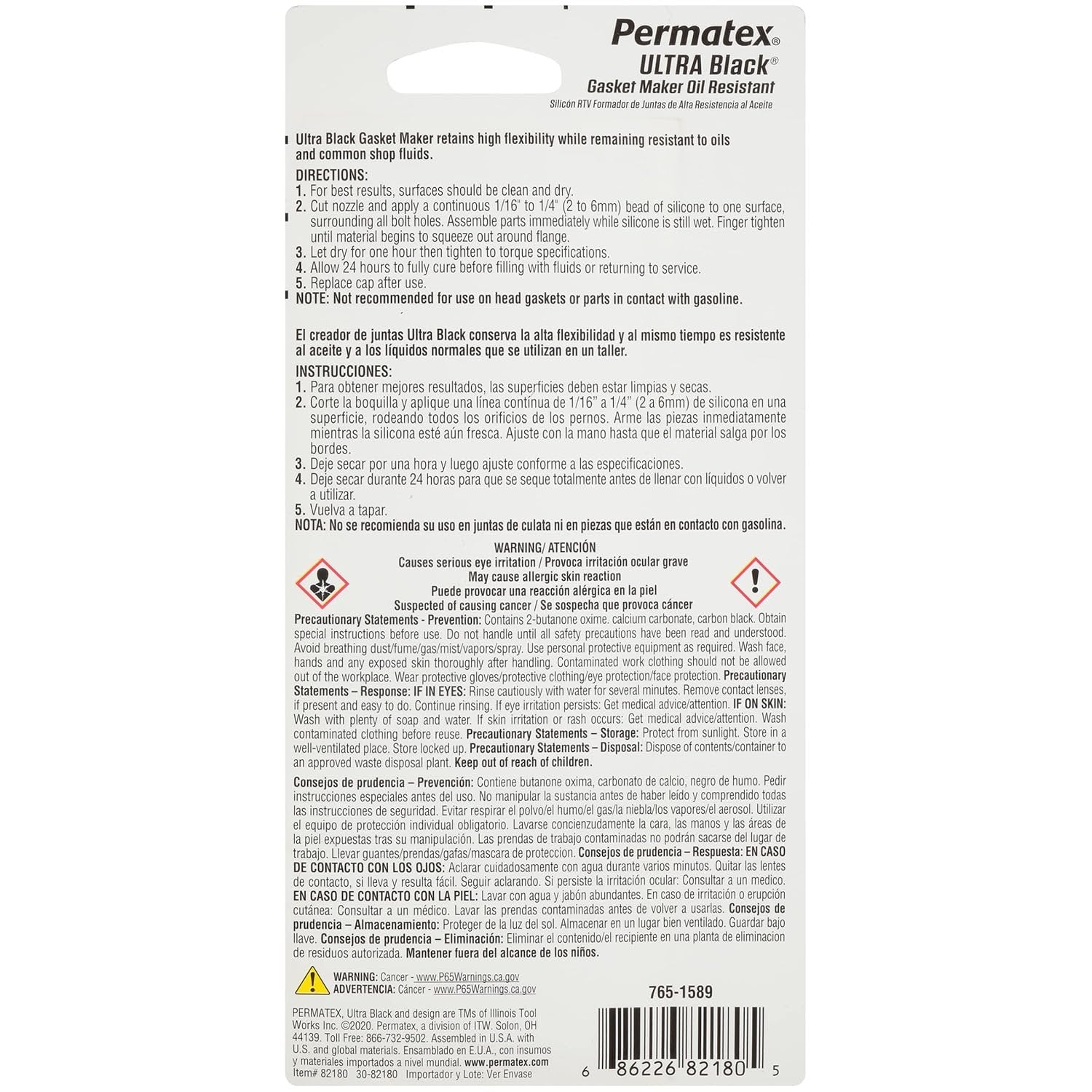 Brand & Part Number: Permatex 82180 Size: 3.35 oz (95g) tube Color: Black Temperature Range: -65°F to 500°F (-54°C to 260°C) Cure Time: 24 hours (full cure) Applications: Oil pans, valve covers, timing covers, differential covers